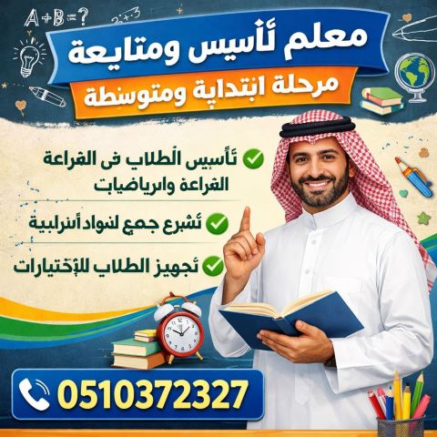 معلم تأسيس ومتابعة - ابتدائي ومتوسط تأسيس قوي في القراءة والكتابة شرح مبسط لجميع المواد الدراسية متابعة الواجبات وتقوية مستوى الطالب تجهيز للاختبارات ورفع التحصيل الدراسي تعليم حضوري أو عن بعد للتواصل