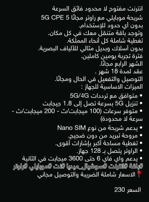 Unlimited high - speed internet Mobily SIM card with free router CPE 5G without any usage limits and a mobile package with you everywhere Comprehensive coverage throughout the Kingdom without wires and an ideal alternative to optical fibers Trial period of two full days The fourth month is free 18 - month contract Delivery and activation on the same day for free Features (compatible with 4g/ 5g frequ