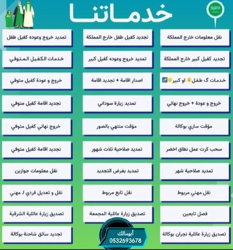 Abu Malik provides you with all public services and follow - up. You are in your place, we serve you via WhatsApp. Experience in most of the sites for labor services such as Absher, Muqeem, Qawi, Madad, Labor and Social Insurance