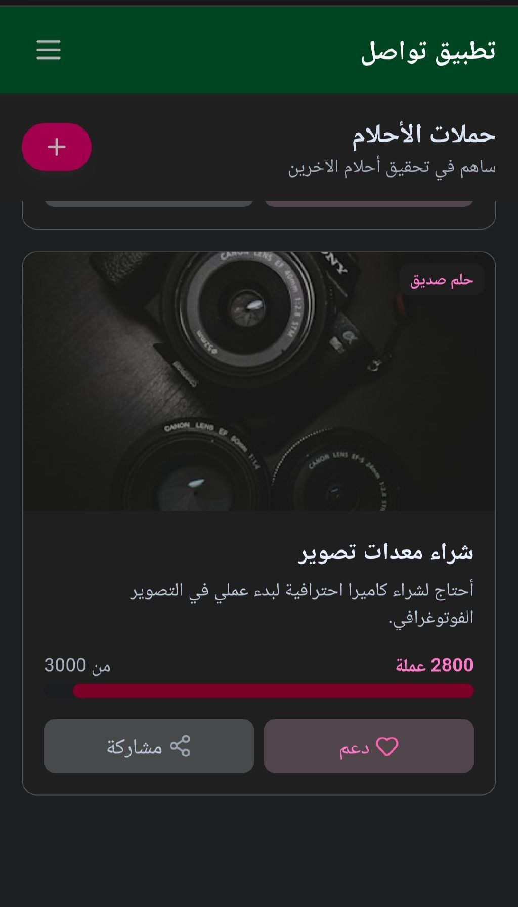 التطبيق جاهز للتشغيل أو التطوير حسب رغبة المستثمر. تواصل فوري بلا حدود رسائل مباشرة، تفاعل لحظي، ومجتمع نشط يجمع الأشخاص حسب الاهتمامات والطموحات. حملات لتحقيق أحلام المستخدمين دعم، تفاعل، ومشاركة حقيقية تصنع فرقا في حياة الناس. مجتمع داعم وملهم كل مستخدم ليس مجرد رقم، بل قصة، حلم، وصوت مسموع. فرصة استثمارية جاهزة تطبيق متكامل، قابل للتوسع، ومناسب لنماذج الربح المختلفة (اشتراكات - حملات مدفوعه