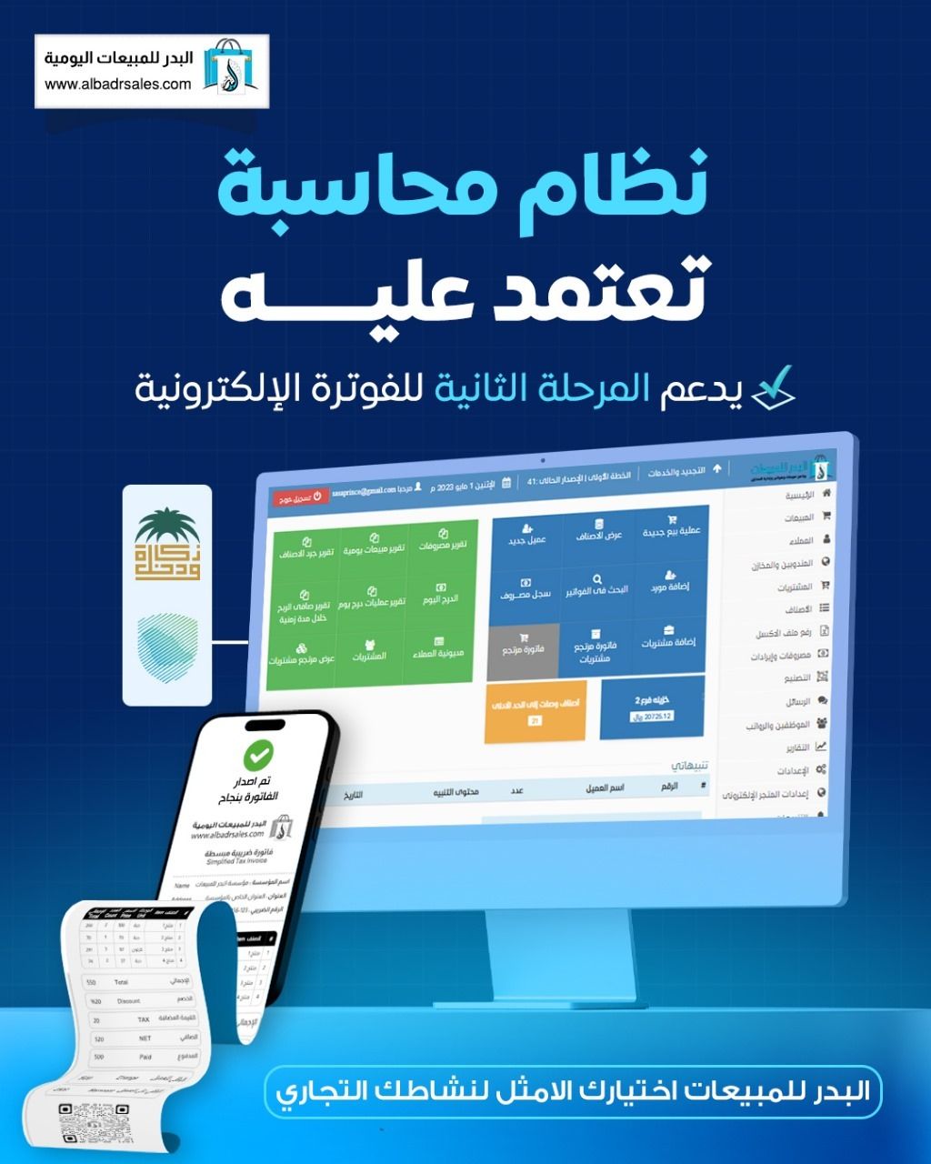 برنامج المبيعات والكاشير الأقوى في السعودية خلي شغلك أسهل ووفر وقتك مع برنامج البدر للمبيعات الذكي بيدعم اللغة العربية واللغة الانجليزية بيدعم القميه المضافة وسهل الاستخدام أتحكم في مبيعاتك ومشترياتك اعمل سندات صرف وقبض تابع حركة مخزونك مع تنبيه بالنواقص يعمل على الكمبيوتر والجوال تقارير ماليه فوريه أطلبه لأن واحصل على نسخة مجانيه لمدة 5 أيام