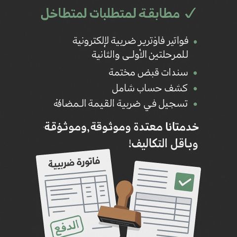 نوفر لكم فواتير ضريبية مطابقة لمواصفات الزكاة والدخل. مع التصديق فواتير ضريبية مرحلة أولى فواتير ضريبية مرحلة ثانية والتحقق لدينا العديد من المؤسسات التي نوفر فواتير ضريبية مطابقة لمواصفات الزكاة، والدخل بأقل نسب تستلم منا فواتير مختمة سند مختم كشف حساب والسجل والتسجيل بالضريبة