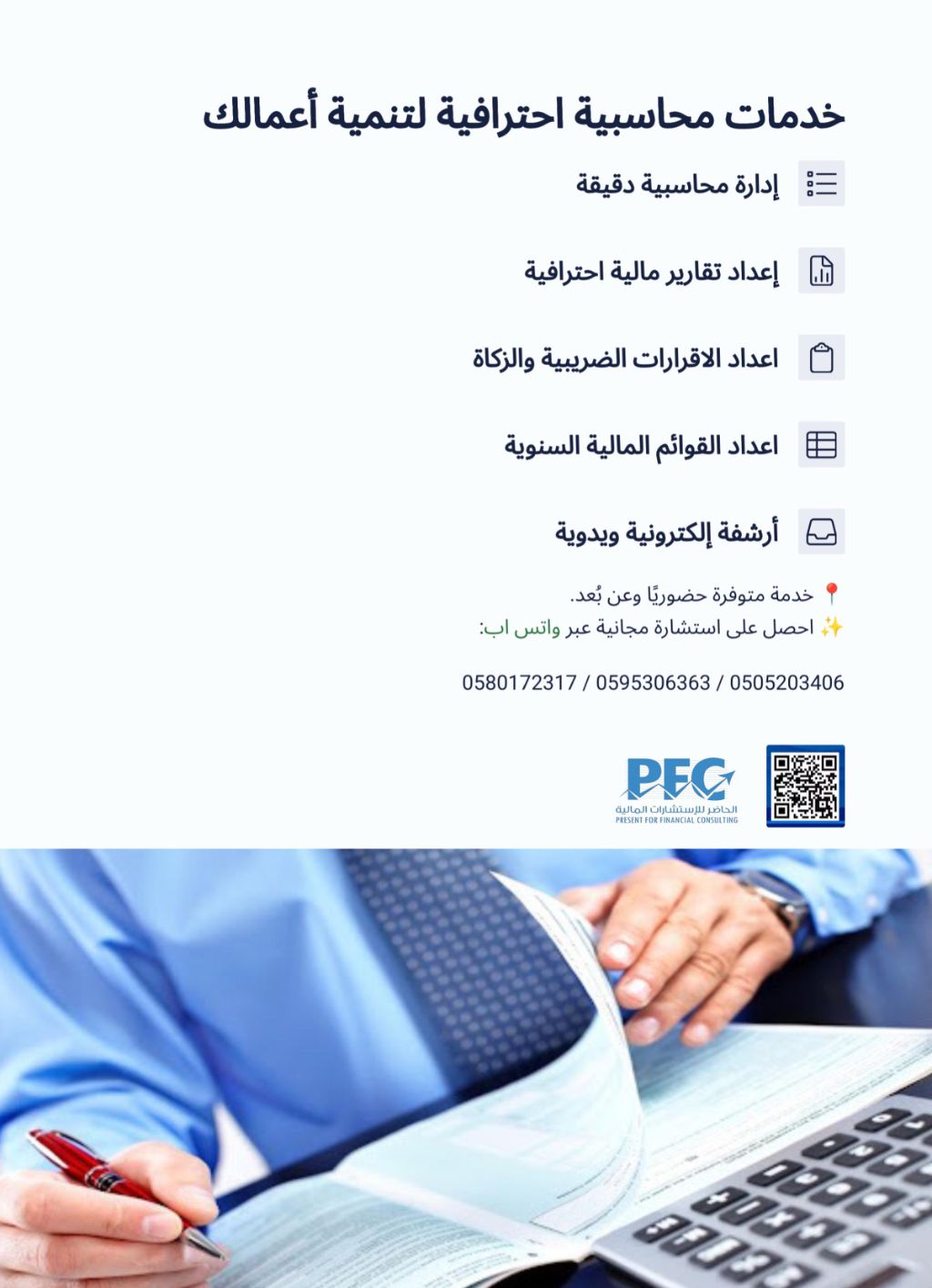 هل تبحث عن خدمات محاسبية احترافية هل تريد ضبط امورك المالية هل تريد تقرير يومي / أسبوعي / شهري عن وضعك المالي هل تريد نمو أعمالك مع ضمان الاستدامة المالية نحن نساعدك في ذلك