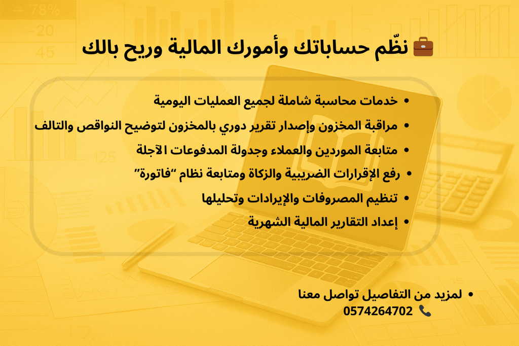 عندك محل أو مشروع لا تترك شغلك يمشي بالعشوائية عندك محل أو مشروع وتبي تعرف بالضبط كم تكسب وكم تصرف تعبت من الفواتير والموردين والمخزون اللي يضيع أنا أوفر لك خدمة محاسبة ومتابعة كاملة لمشروعك، ارتب لك كل امورك المالية والمخزون بطريقة سهلة وواضحة، بدون ما تحتاج توظف محاسب بدوام كامل. شغلي يشمل ارتب لك المبيعات والمصاريف والمشتريات أول بأول. أتابع لك الموردين والعملاء والدفعات. أتابع لك المرتبات واسويلك
