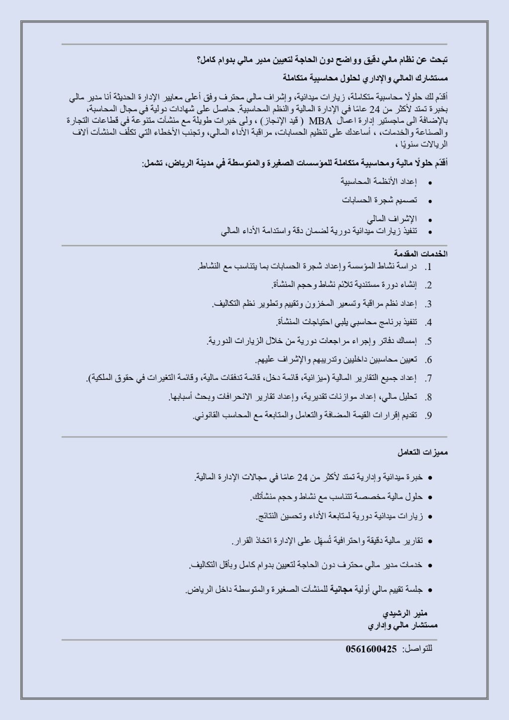 تبحث عن نظام مالي دقيق وواضح دون الحاجة لتعيين مدير مالي بدوام كامل مستشارك المالي والاداري لحلول محاسبية متكاملة أقدم لك حلولا محاسبية متكاملة، زيارات ميدانية، واشراف مالي محترف وفق أعلى معايير الإدارة الحديثة أنا مدير مالي بخبرة تمتد لأكثر من 24 عاما في الإدارة المالية والنظم المحاسبية. حاصل على شهادات دولية في مجال المحاسبة، بالاضافة الى ماجستير إدارة أعمال) MBA قيد الانجاز (ولي خبرات طويلة مع