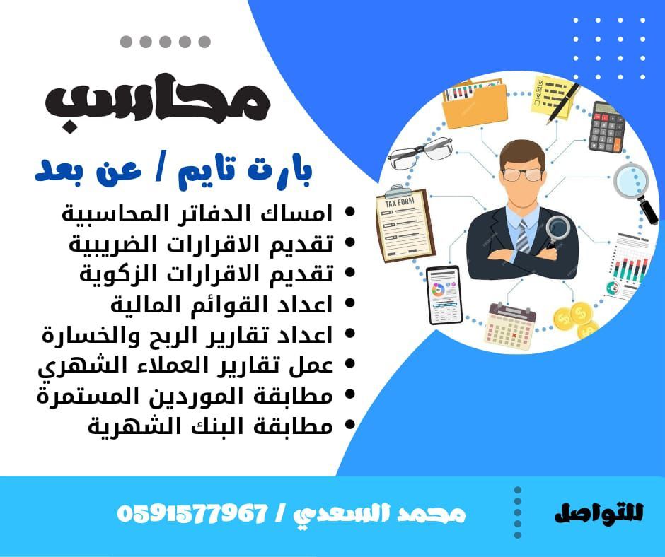 رفع الاقرارات الضريبية رفع الاقرارات الزكوية اعداد تقارير الربح والخسارة لمشروعك امساك الدفاتر المحاسبية اعداد موظفينك لامساك الدفاتر المحاسبية الاستشارات المالية مجال العمل (صناعي - تجاري - خدمي - تعليمي)