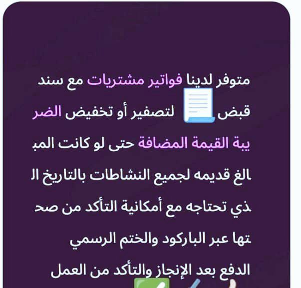 اصدار فواتير مبيعات ضريبية (ضريبة القيمة المضافة) للشركات والمؤسسات التي عليها مبالغ ضريبية لتقليل المبالغ الضريبية التي عليها وتصفيرها الفواتير صادرة من شركة قائمة وصحيحة 100%