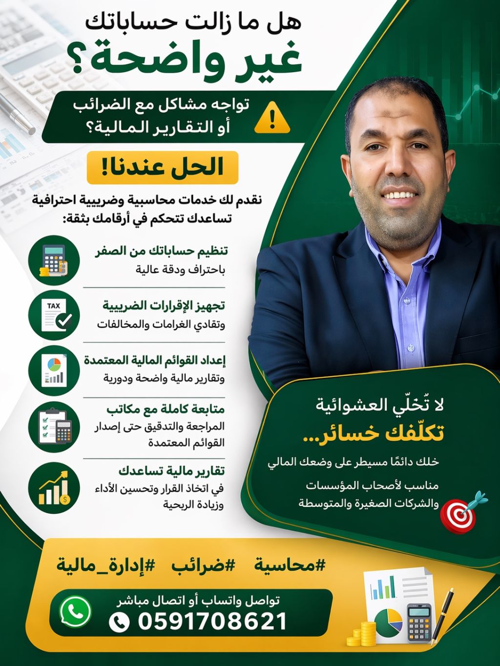 أقوم بتقديم خدمات محاسبية وضريبية بشكل احترافي أقوم بتنظيم الحسابات من الصفر باحتراف تجهيز ورفع الاقرارات الضريبية والمطابقة لنظام ضرييه القيمة المضافة لتفادي الغرامات، اعداد القوائم المالية المعتمدة بدقة عالية، متابعة كاملة مع مكاتب المراجعة والتدقيق. مناسب لأصحاب الشركات والمؤسسات المتوسطة والصغيرة