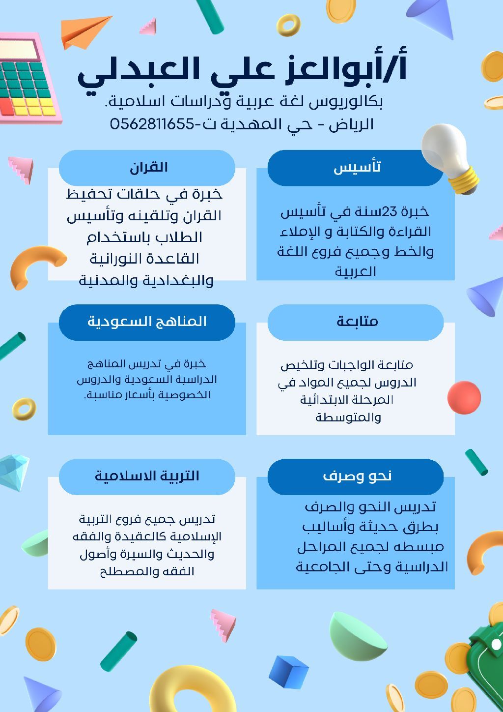 معلم لغة عربية خبرة في التأسيس للقراءة والكتابة والإملاء والخط. وتدريس النحو والصرف بطرق سهلة. متابعة طلاب الابتدائية والمتوسطة لجميع المواد. تدقيق لغوي