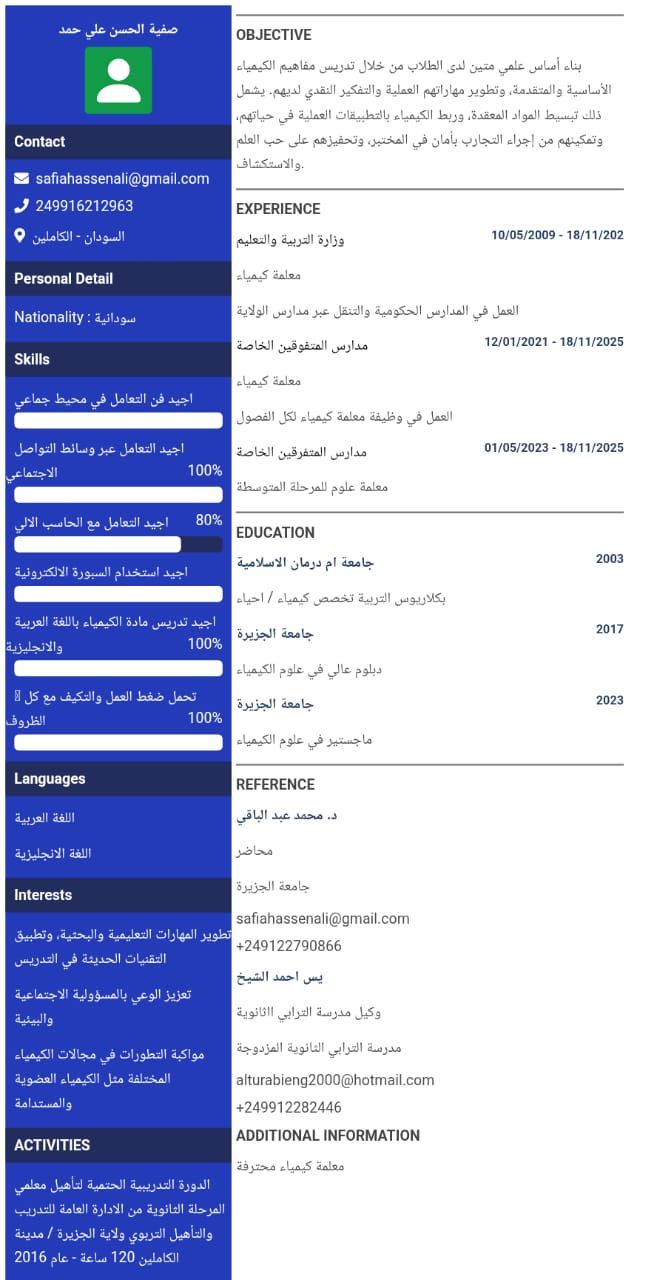 معلمة كيمياء جميع الفصول - ماجستير علوم كيمياء) خبرة في التعليم بالمدارس السودانية الحكومية والخاصة لمدة 16 عام متصلة. ترغب في العمل بالمملكة العربية السعودية. للتواصل رقم سعودي / رقم سوداني / ايميل