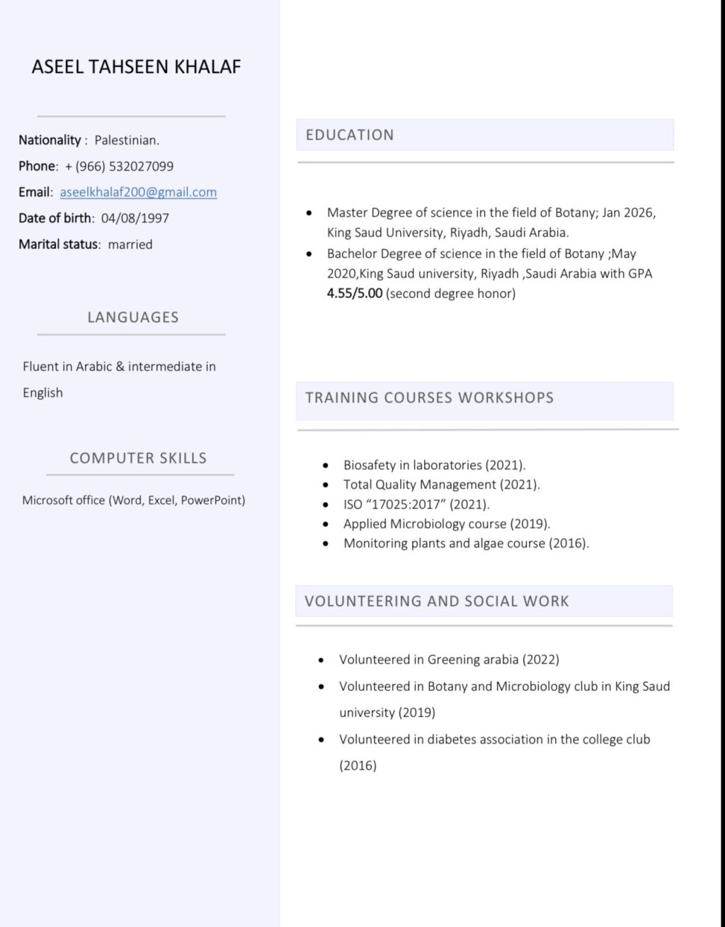 خريجه ماجستير (قسم النبات والأحياء الدقيقة) من جامعة الملك سعود. ابحث عن فرصة عمل مناسبة في مجال التعليم أو المختبرات. لدي مهارات عالية في Microsoft Office (Word, Excel, PowerPoint) ولدي خبرة سنة في مجال المختبرات في قسم الأحياء الدقيقة. أتمتع بحسن التعامل والاتزان والقدرة على التعلم السريع. أستطيع بالعمل الحضوري في الرياض / البريد الالكتورني