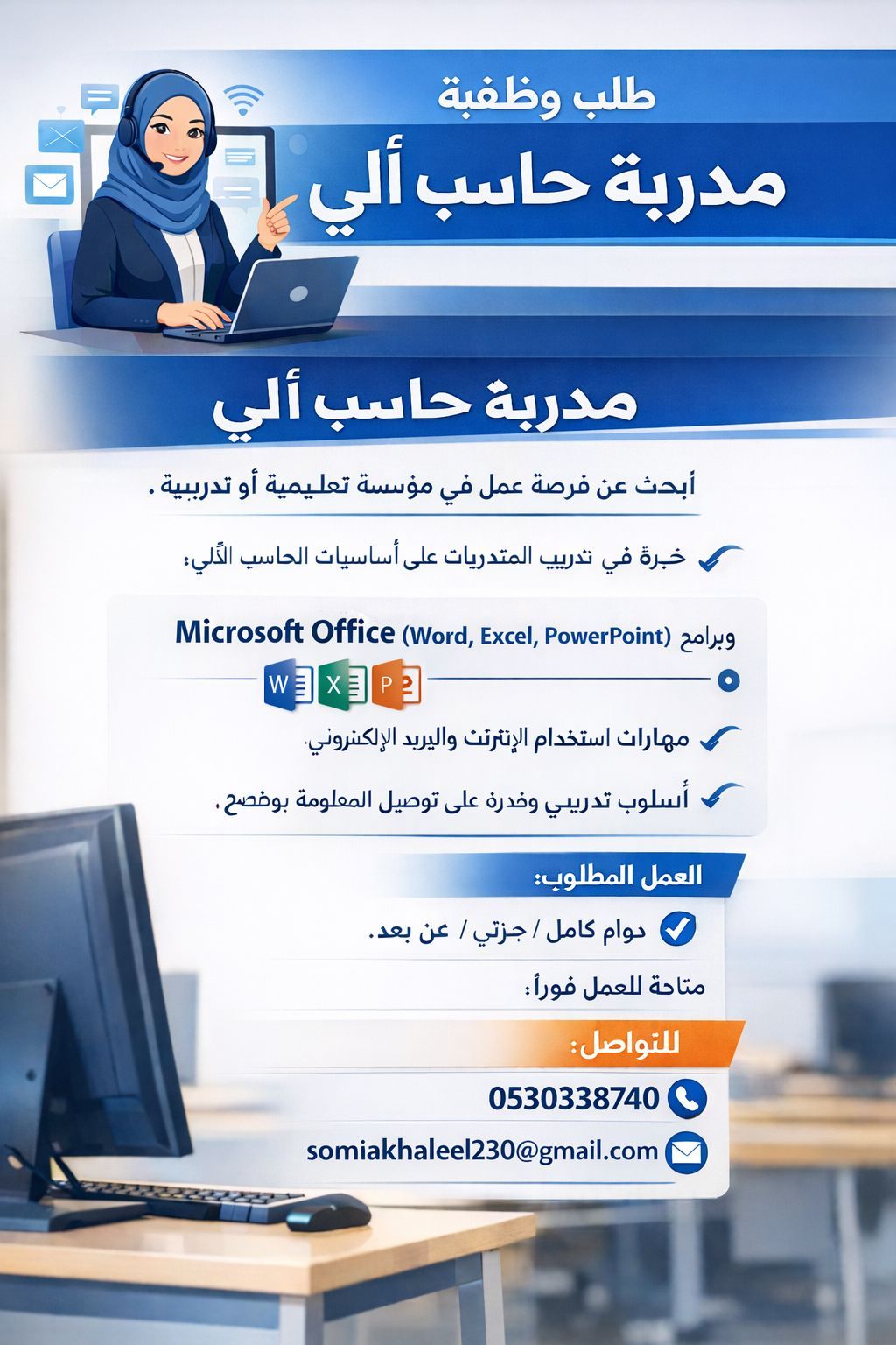 مدربة حاسب آلي مؤهلة ابحث عن فرصة عمل في مؤسسة تعليمية أو تدريبية، امتلك خبرة في تدريب المتدربات على أساسيات الحاسب الآلي، وبرامج Microsoft Office (Word, Excel, PowerPoint) اضافة الى مهارات استخدام الانترنت والبريد الألكتروني. أتميز بأسلوب تدريبي مبسط، والقدرة على ايصال المعلومة بوضوح، مع الالتزام بالمواعيد والعمل بروح الفريق. لدي مهارات تواصل عالية والقدرة على التعامل مع مختلف المستويات التعليمي