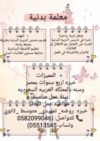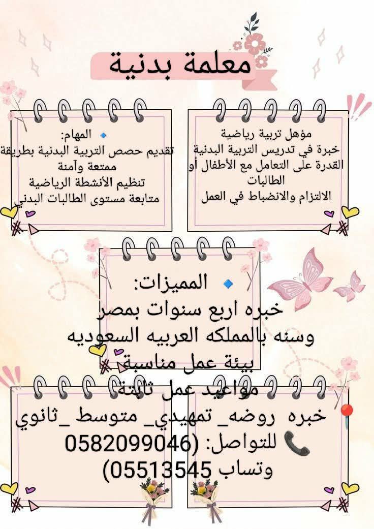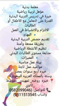 ابحث عن عمل مؤهل تربية رياضية خبرة في تدريس التربية البدنية القدرة على التعامل مع الاطفال أو الطالبات الالتزام والانضباط في العمل المهام تقديم حصص التربية البدنية بطريقة ممتعة وآمنة تنظيم الأنشطة الرياضية متابعة مستوى الطالبات البدني خبرة روضة - تمهيدي - متوسط - ثانوي عملت بمدرسة في الرياض 2026 حتى نهاية العام الدراسي