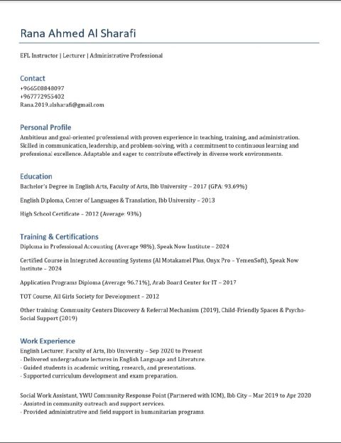 معلمة لغة انجليزية بخبرة تزيد عن 7 سنوات، حاصلة على بكالوريوس آداب انجليزي بامتياز وأتمتع بمستوى متقدم في اللغة. أطبق أساليب تعليمية حديثة وتفاعلية لتعزيز مهارات الطلاب وبناء ثقتهم بأنفسهم، وخلق بيئة تعليمية محفزة تشجع الابداع وتحقق تقدما واضحا في الأداء الأكاديمي واللغوي. حاليا ابحث عن فرصة للعمل في بيئة تعليمية متميزة داخل الرياض