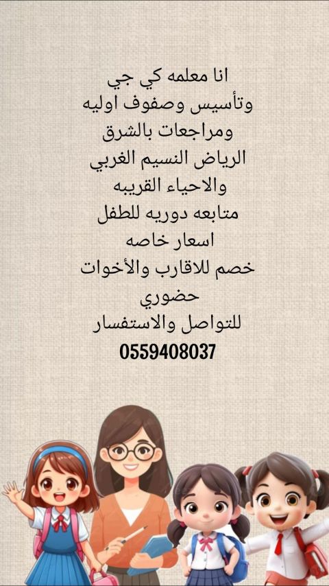أنا معلمه مصريه في النسيم الغربي تأسيس وصفوف أولية عربي وانحليزي وحساب وتربية دينية وعلوم ودراسات خبرة في التعليم البرايفت والمدارس حضوري لبيت الطالب في شرق الرياض وبيتي متابعه دوريه للطفل وفرق مستوى ملحوظ
