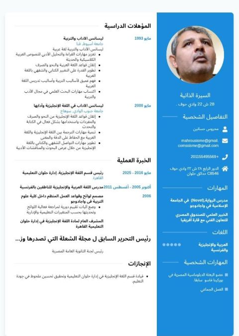 مصري الجنسية حاصل على ليسانس اللغة العربية وآدابها والعلوم الاسلامية إقامة سارية