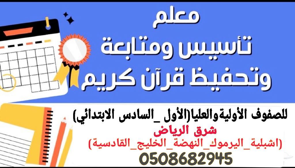 A follow - up teacher, establishing and memorizing the Holy Qur’ an for the primary and upper grades, helping in solving the student’s assignments, developing ways of thinking while preparing for the next lesson, explaining the lesson easily, processing reading and writing, reviewing test days, and memorizing the Holy Qur’ an with the rulings. For reservations and inquiries, Location Riyad