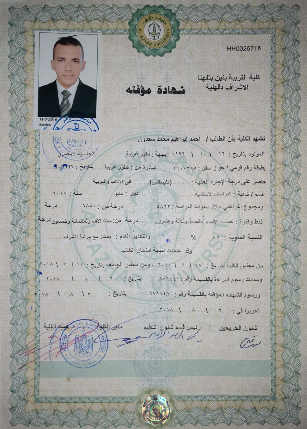 محفظ قرآن كريم بالتجويد مصري حاصل على ليسانس أداب وتربية قسم دراسات اسلاميه 2018 بتقدير ممتاز مع مرتبة الشرف ومدرس مواد شرعيه