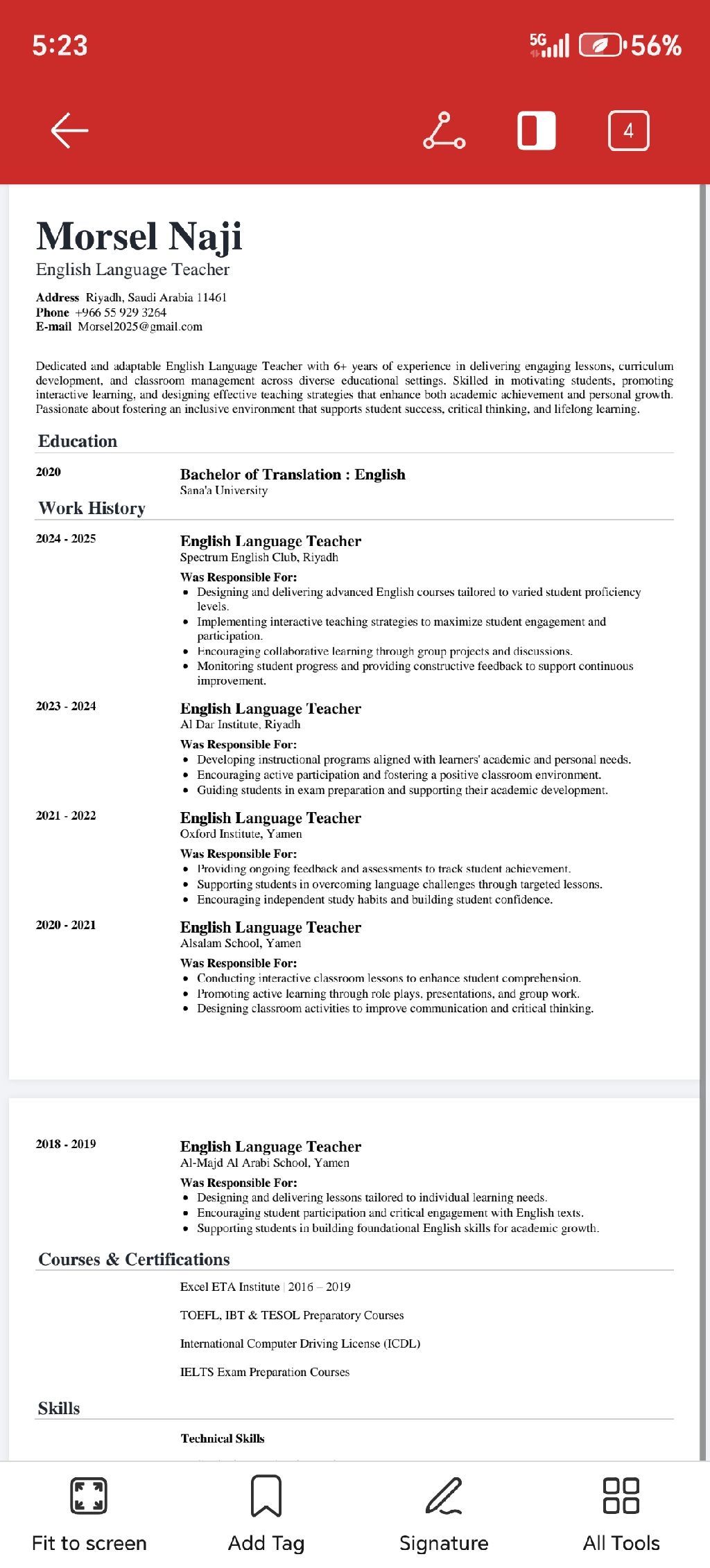 معلم لغة انجليزية متفان ومتكيف، بخبرة تزيد عن ست سنوات في تقديم دروس شيقة، وتطوير المناهج، وإدارة الصفوف الدراسية في بيئات تعليمية متنوعة. ماهر في تحفيز الطلاب، وتعزيز التعلم التفاعلي، وتصميم استراتيجيات تدريس فعالة تعزز التحصيل الأكاديمي والنمو الشخصي. شغوف بتهيئة بيئة شاملة تعزز نجاح الطلاب، وتحفز التفكير النقدي، وتحفز التعلم مدى الحياة