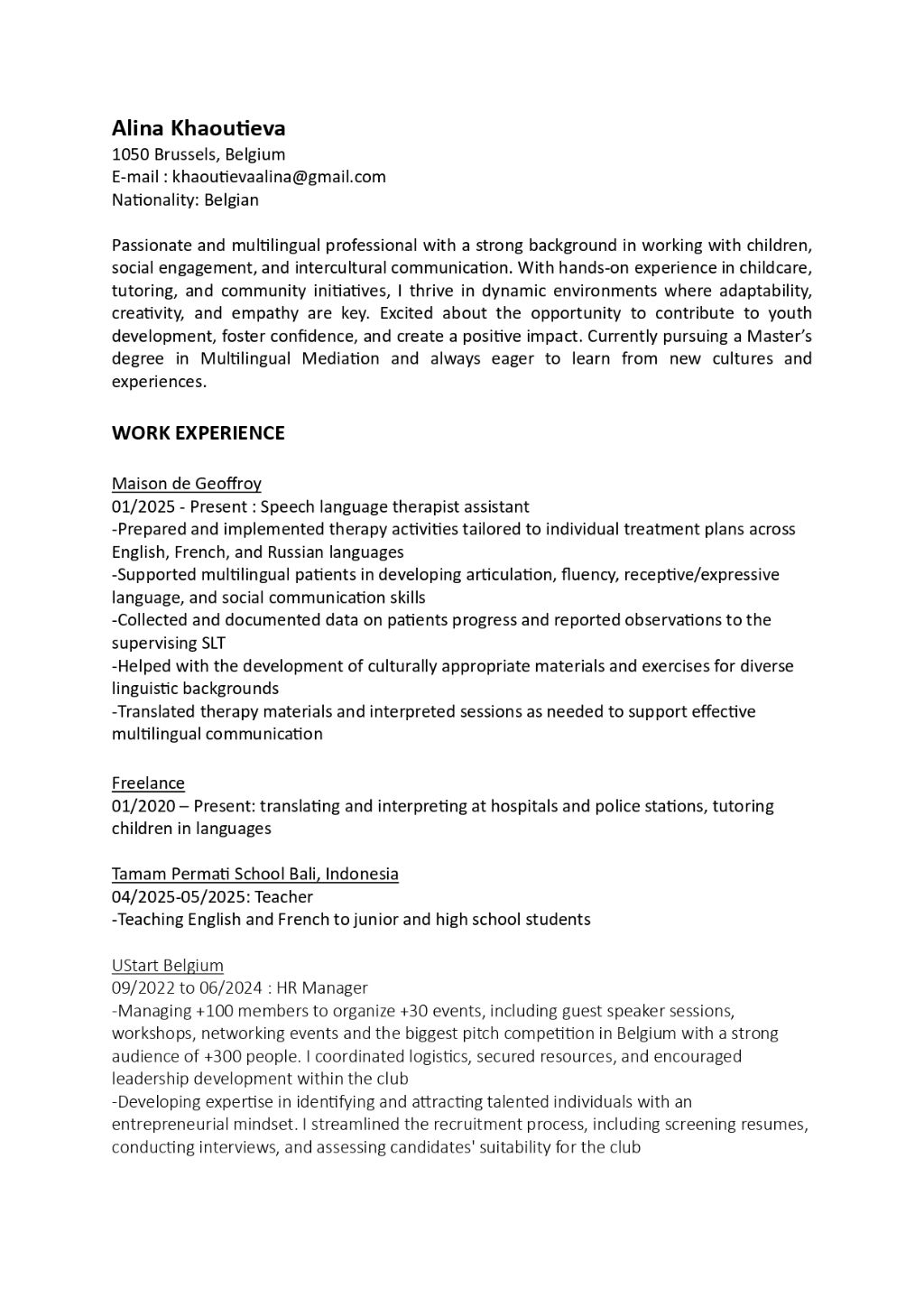 My name is Alina. I am 28 years old, from Belguim, living in Brussels, and seeking employment as a teacher in Saudi Arabia. Especially in Riyadh, I can speak four languages fluently (English, Russian, French, and Dutch) and a little bit of Arabic. This is a brief about me Passionate and multilingual professional with a strong background in working with children, social engagement, and intercultural