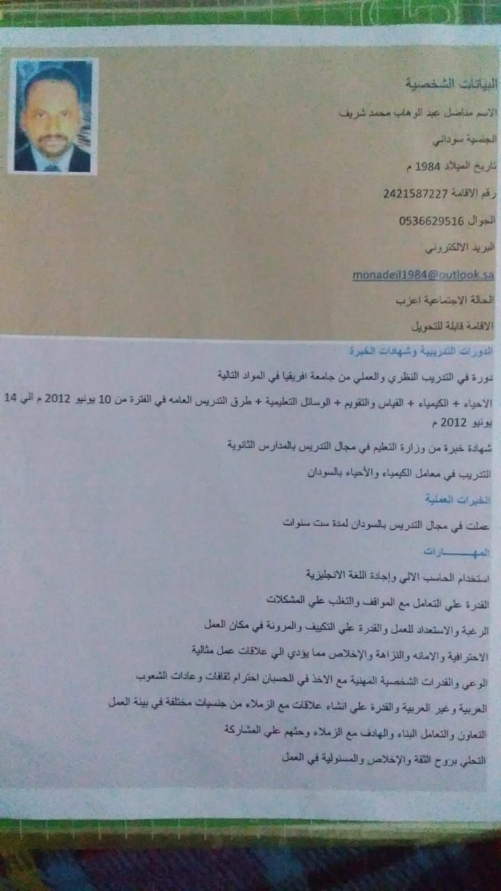 وظيفة تعليم في المدارس الثانوية خبرة في المدارس الأهلية السعودية تخصص أحياء وكيمياء