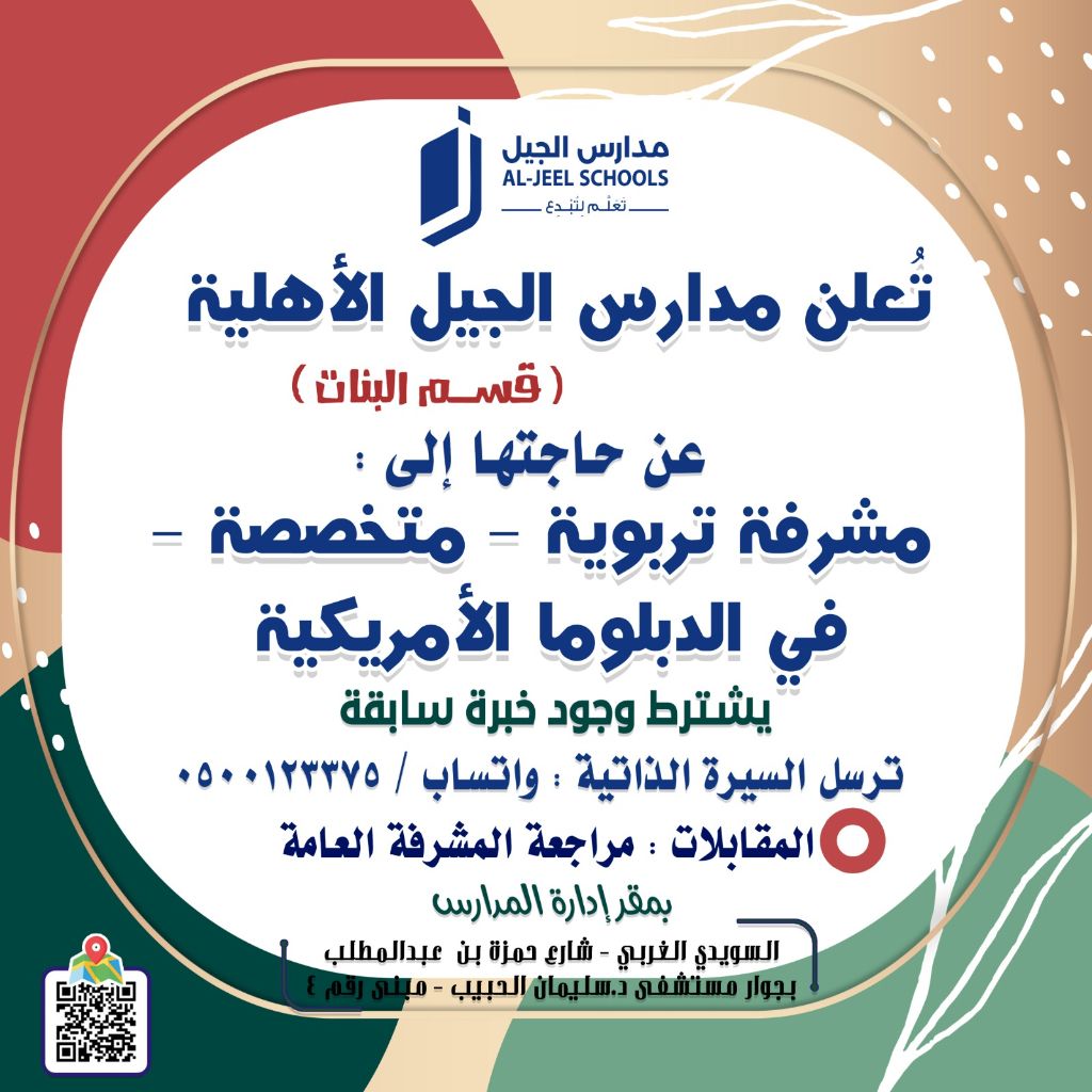 تعلن مدارس الجيل الأهلية في الرياض عن حاجتها الى مشرفة تربوية متخصصة في الدبلوما الأمريكية (لقسم البنات) يشترط وجود خبرة سابقة. ترسل السيرة الذاتية واتساب المقابلات مراجعة المشرفة العامة بمقر إدارة المدارس في الرياض حي السويدي الغربي - شارع حمزة بن عبد المطلب - بجوار مستشفى د سليمان الحبيب مبنى رقم 4
