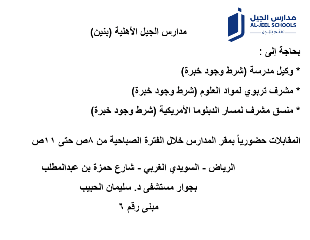 مدارس الجيل الأهلية بنين بحاجة الى وكيل مدرسة (شرط وجود خبرة) مشرف تربوي لمواد العلوم (شرط وجود خبرة) منسق مشرف لمسار الدبلوما الأمريكية (شرط وجود خبرة) المقابلات حضوريا بمقر المدارس خلال الفترة الصباحية من 8 ص حتى 11 ص الرياض - السويدي الغربي - شارع حمزة بن عبد المطلب - بجوار مستشفى د سليمان الحبيب مبنى رقم 6