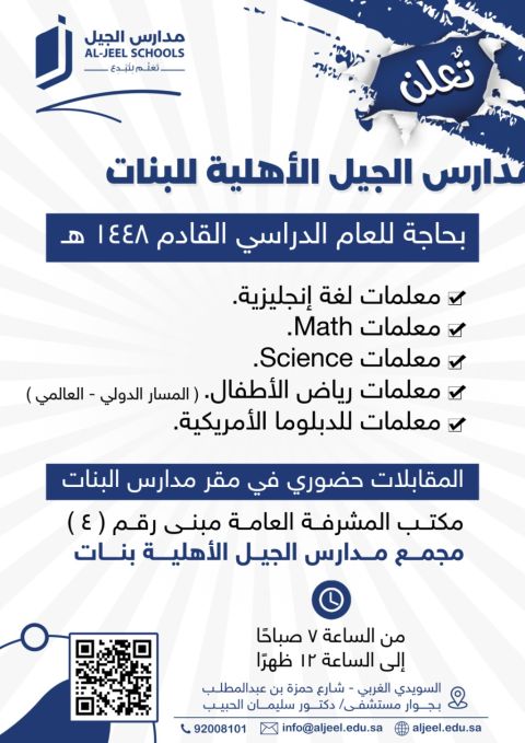 Al - Jeel Private Schools for Girls is seeking highly qualified female teachers to join its International Curriculum in the following subject areas English Language Mathematics Science Kindergarten Location Riyadh (Applicants must be Riyadh - based) Academic Year The upcoming academic year 1448 AH Interview Details Interviews will be conducted in person during the morning hours Location Al - Suwaidi