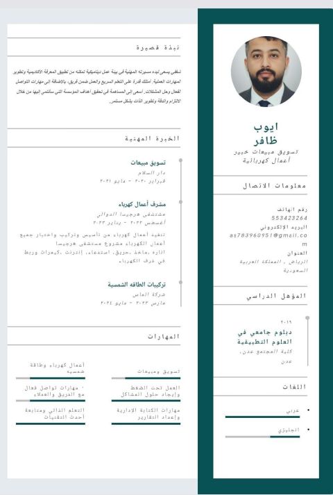 تقني طموح بخلفية هندسية متينة في الالكترونيات والكهرباء العامة، امتلك خبرة واسعة في تركيب وصيانة األنظمة الأمنية) CCTV (والشبكات. أجمع بين المهارات الفنية الميدانية والقدرات الرقمية في التصميم الجرافيكي وإدارة المحتوى والمنصات الالكترونية، مما يمكنني من تقديم حلول متكاملة في بيئات العمل المختلفة