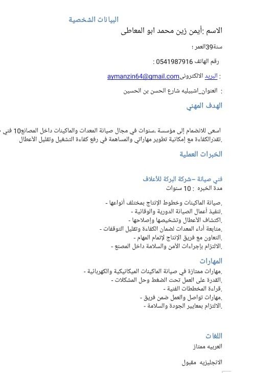 فني صيانة معدادات والماكينات (الميكانيكة والكهربائية) داخل المصانع علي علم كامل بخطوط الانتاج بمختلف أنواعها تنفيذ أعمال الصيانة الداورية والوقائية واكتشاف الأعطال الالتزام باجراءات الحماية والسلامة داخل المصنع عدد سنوات الخبرة 15 سنوات في القاهرة متواجد في الرياض ومتاح نقل كفالة وجاهز للعمل في أي مكان داخل المملكة