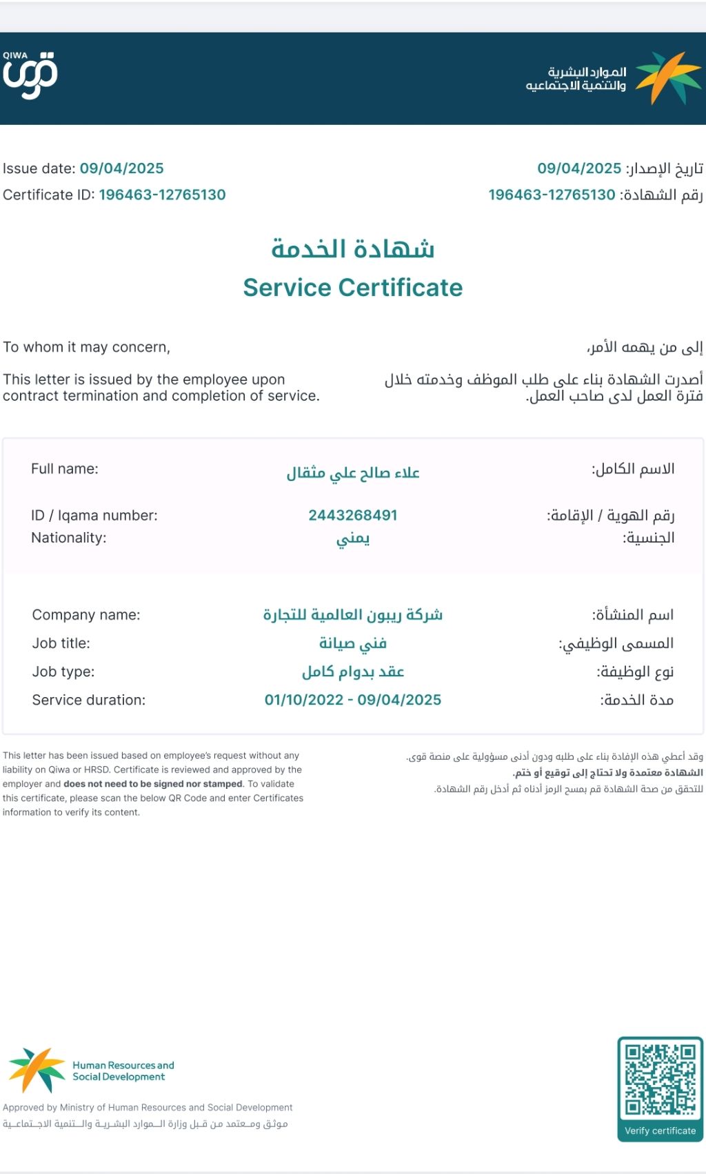 أنا فني صيانة ومهندس اجهزة كهربائية ومنزليه وسيشوارات واجهزة العناية وكذلك على معرفة بقطع غيار الصيانة ومتطلباتها وعمل تقارير عن الاجهزة مع تحديد الأعطال المتكرره والحلول اللازمة عملت كفني صيانة وكمسؤول عن الصيانة وفريق الصيانة وكذلك مسؤول عن قطع غيار الصيانة ومتطلباتها لدي عدة دورات كمبيوتر وادخالات وأجيد اللغة الانجليزية بشكل جيد