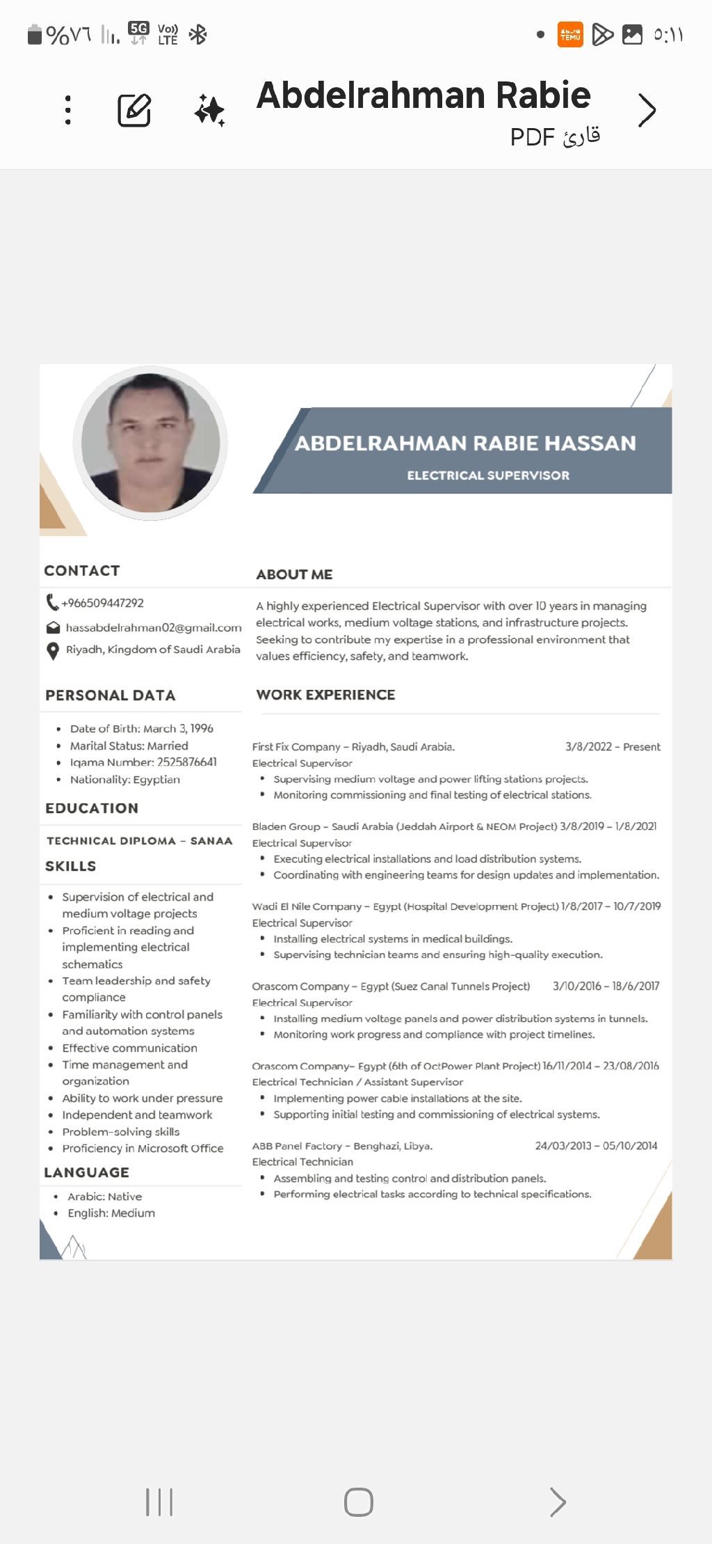 مشرف كهربائي تركبات واسلسيوان وجهد متوسط وانخفاض وجميع أنواع العمال والكهرباء أقامه