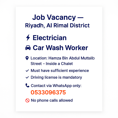 We are looking for an Electrician and a Car Wash Attendant (Vehicle Washer) for a resort/ chalet in Riyadh, Al - Rimal district, Hamza Ibn Abdul Muttalib Street. Requirements Sufficient Experience in the respective field. Essential Condition Must possess a valid Driving License. Location Requirement Only applicants currently residing within Riyadh will be considered. Application Process Contact via