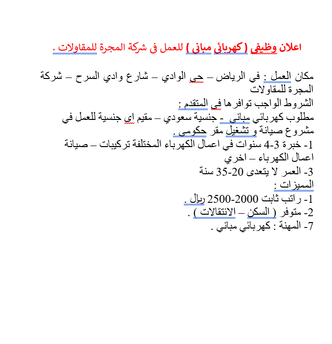 اعلان وظيفي (كهربائي مباني) للعمل في شركة المجرة للمقاولات. مكان العمل في الرياض - حي الوادي - شارع وادي السرح - شركة المجرة للمقاولات الشروط الواجب توفرها في المتقدم مطلوب كهربائي للعمل في أحد المشروعات الحكومية الجنسية سعودي - مقيم هندي - مصري - سوداني - باكستاني - بنغلادش - خبرة كافية. المميزات راتب 2000 - 2500 ريال - متوفر سكن عدد ساعات العمل 9 ساعة منهم ساعة راحة - الجمعة إجازة