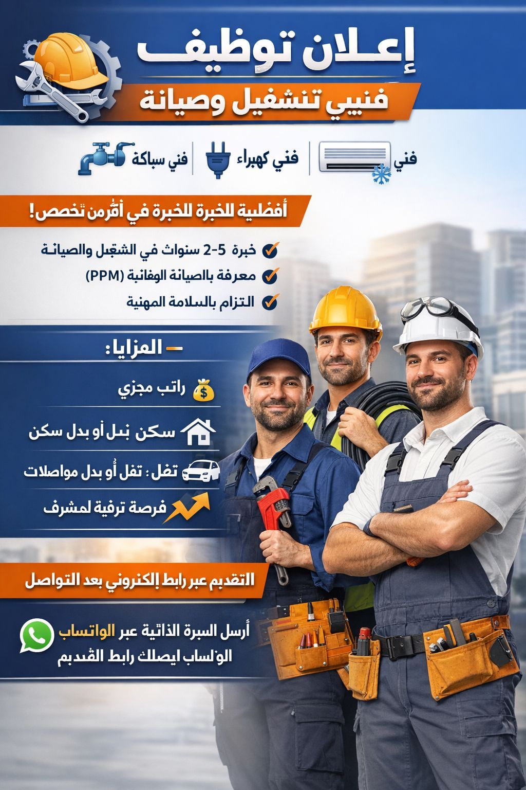 توظيف فنيين تشغيل وصيانة سباكة كهرباء تكييف في الرياض حي الصحافة التوظيف بمسمى فني مع فرصة الترقية الى مشرف حسب الأداء الأولوية للي عنده خبرة في أكثر من مجال خبرة 2 - 5 سنوات معرفة بالصيانة الوقائية (PPM) التزام في السلامة راتب مجزي + سكن / بدل + نقل + تطوير وظيفي التقديم أرسل سيرتك على الواتساب ونرسل لك رابط التقديم لتعبئة