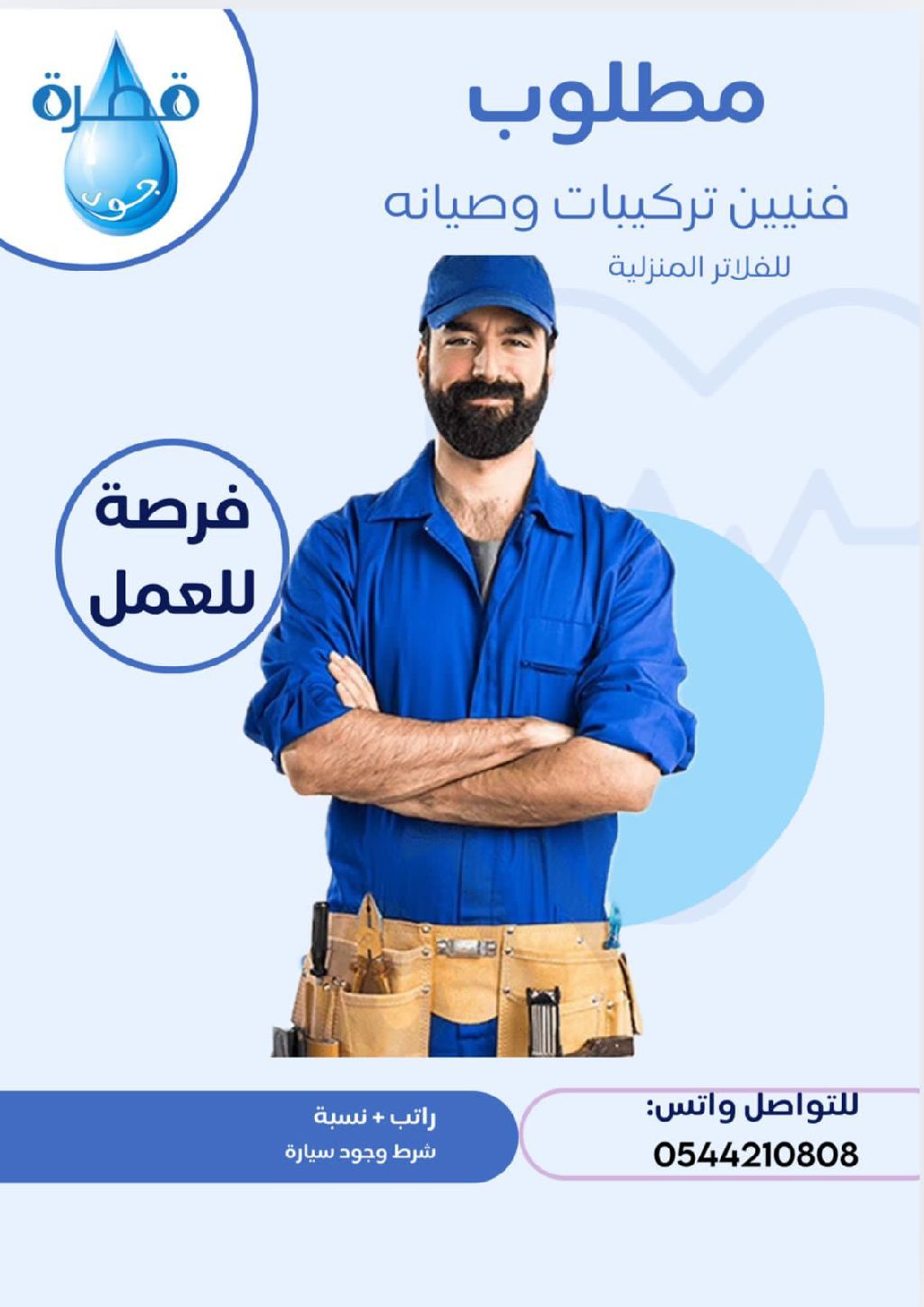 محتاجين فنيين لشركة تحلية مياه شرط خبرة كويسه في المجال أن يكون لديه سيارة للتفاصيل التواصل علي الرياض حي الفوطة ش الخزان
