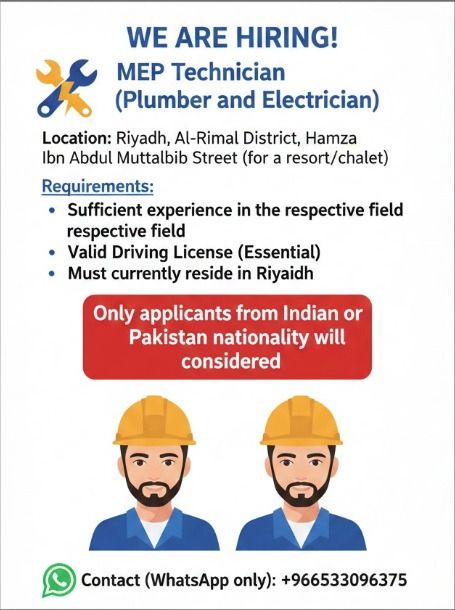 WE ARE HIRING MEP Technician (Plumber and Electrician) Location Riyadh, Al - Rimal District, Hamza Ibn Abdul Muttalib Street (for a resort/ chalet) Requirements Sufficient experience in the respective field Valid Driving License (Essential) Must currently reside in Riyadh Only applicants from Indian or Pakistani nationality will be considered. Contact (WhatsApp only)