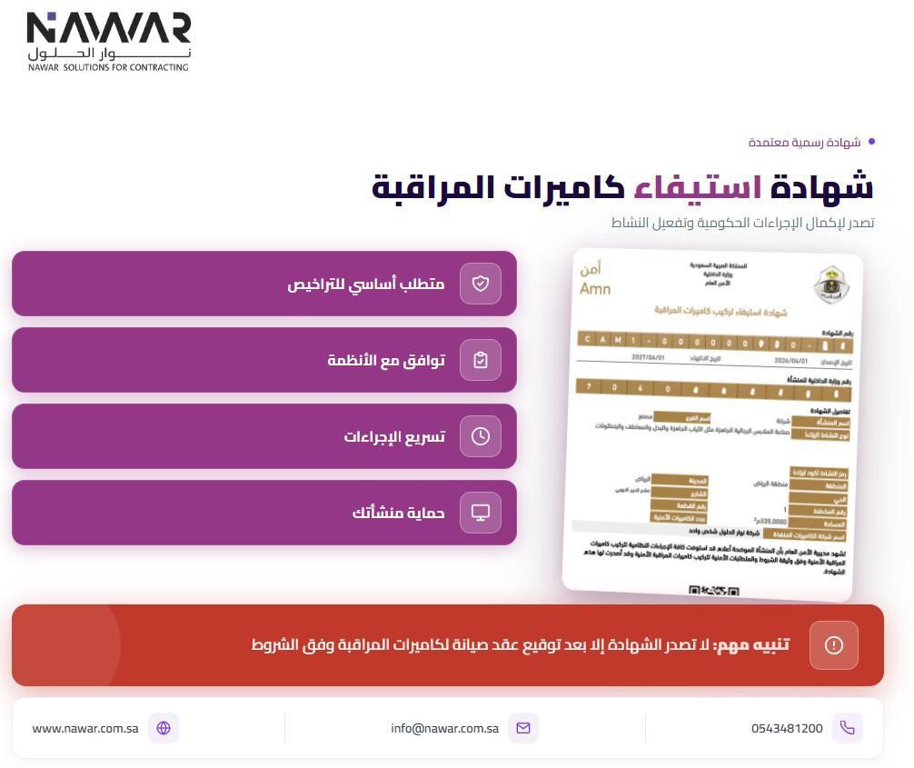 عقود صيانة + شهادة استيفاء هل تبحث عن الأمان والاحترافية في أنظمة الكاميرات والشبكات نقدم لك عقد صيانة دوري بأسعار مناسبة اصدار شهادة استيفاء معتمدة فحص كامل للأنظمة (كاميرات - شبكات - سمارت هوم) دعم فني سريع وخدمة مضمونة الموقع الرياض احجز الآن وخلي نظامك دايما آمن وبدون مشاكل