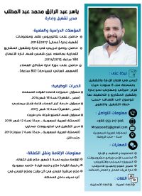 مسؤول ومدير اداري خبرة أكثر من 8 سنوات بالسوق السعودي تعليم عالي بكالوريوس أجيد اللغة العربية والانجليزية بشكل جيد جدا عملت في ادارة وتشغيل العديد من القطاعات قطاع التصنيع والمصانع قطاع السياحة والفنادق وادارة قاعات الحفلات والمنتجعات السياحية والصحية عملت في قطاع التصوير الفيديو والفتوغرافي عملت في قطاع المبيعات والتسويق الالكتروني والتسويق الميداني العمل على تطوير وادارة المشاريع الصغيرة والمتوسطه