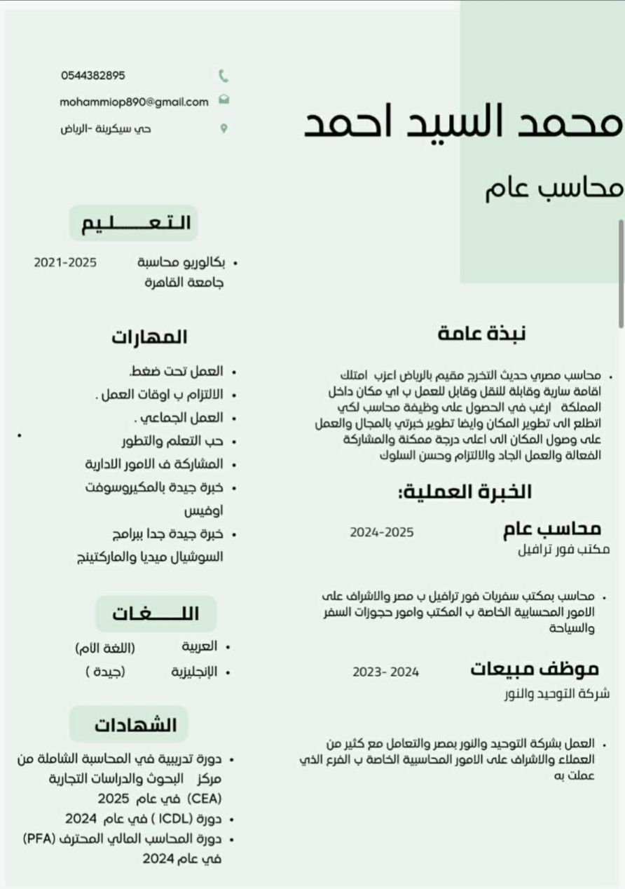 حاصل على بكالوريوس في المحاسبة عربي يناير سنة 2025 من حصل على شهادة دورة تدريبية من مركز البحوث والدراسات التجارية في المحاسبة شاملة الكترونية (CEA) من جماعة القاهرة واشتغلت في شركة فور ترافيل لاحجز السفر والسياحة في مصر 2025