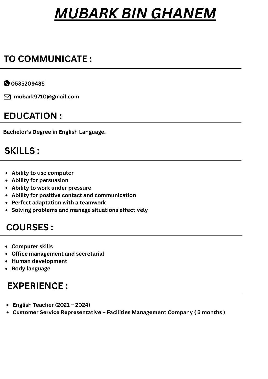 ابحث حاليا عن فرصة عمل مناسبة أستطيع من خلالها تقديم أفضل ما لدي من مهارات وخبرات، والعمل ضمن فريق يهدف الى النجاح والتطوير المستمر