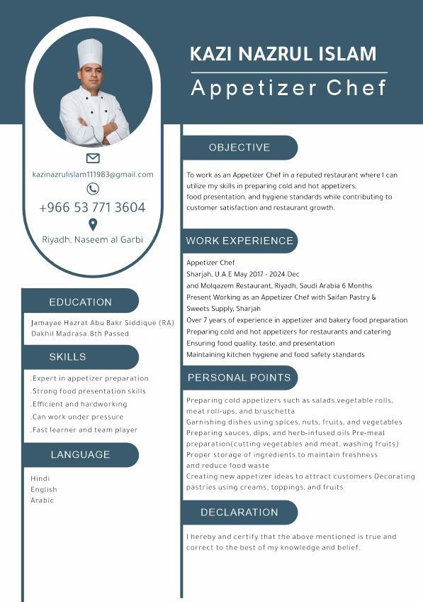 I am Kasi Nazrul ialam 7 years presently Working Appetizer Chef With Saifan pastry and Sweets Supply Sharjah, UAE From 2017 to 10012025