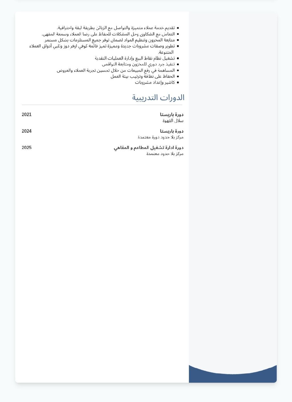 ابحث عن عمل في كوفي ومطعم في الرياض لديه خبرة 3 سنين ونصف خبراتي بمجال هيد باريستا - تحضير مشروبات الاسبريسو الباردة والحارة - تحضير المشروبات لكركديه والماتشا والموهيتو الأيس تي خوخ - خدمة العملاء - التواصل الفعال - مهارات التواصل - إدارة الوقت - الكاشير - إدارة النقدية - معالجة الدفعات - خدمة العملاء - جرد المخزون ورفع المبيعات وتقليل الهدر