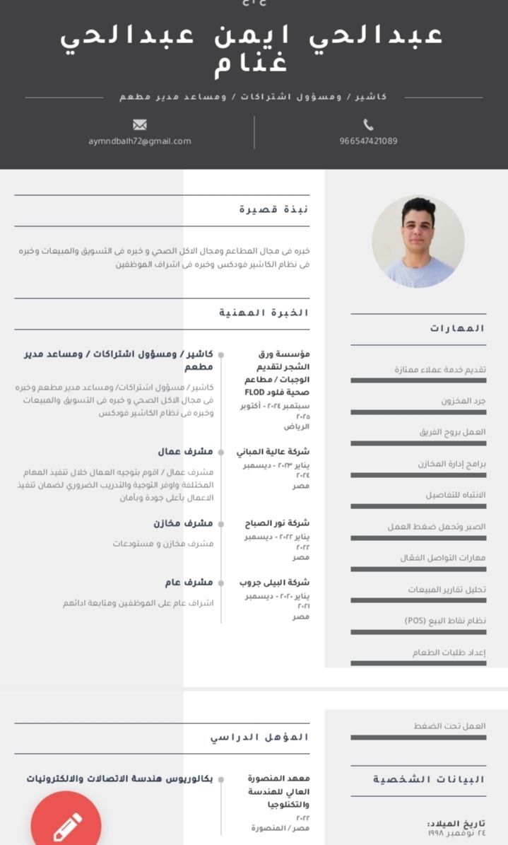 ابحث عن فرص عمل في الرياض أنا خبر سنة ونصف في مجال الأكل الصحي وعندي خبر سنتين في كاشير ومسؤول اشتراكات ومساعد مدير في مطاعم فلود للأكل الصحي