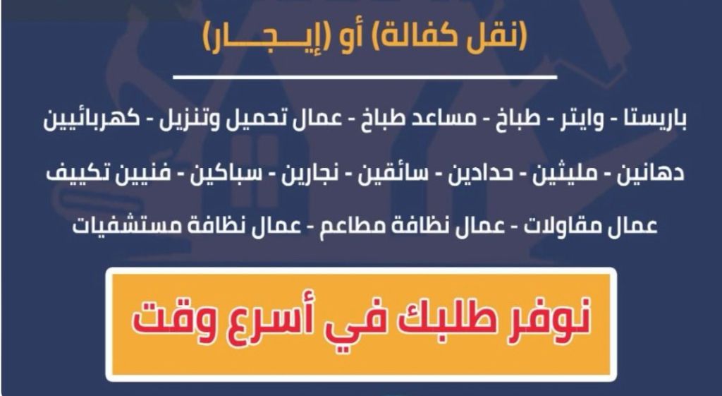 مع شركة النهضة العربية. نوفر لك العمالة - النبالية - والبنغالية - والهندية - المدربة للعمل داخل - المطاعم - والكافيهات - والفنادق - ومغاسل السيارات - وسائقين دباب - ويوجد عماله باريستا وطباخين (متاح بنظام أجير - أو نقل خدمات) العمالة متاحة داخل المملكة وجاهزين للعمل فورا اتصل الآن