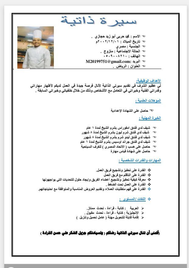 أنا شيف شرقي وإيطالي ابحث عن عمل أنا موجود في الرياض خابره 3 سنين ونصف في مجال السيحه. ومطاعم في شرم الشيخ
