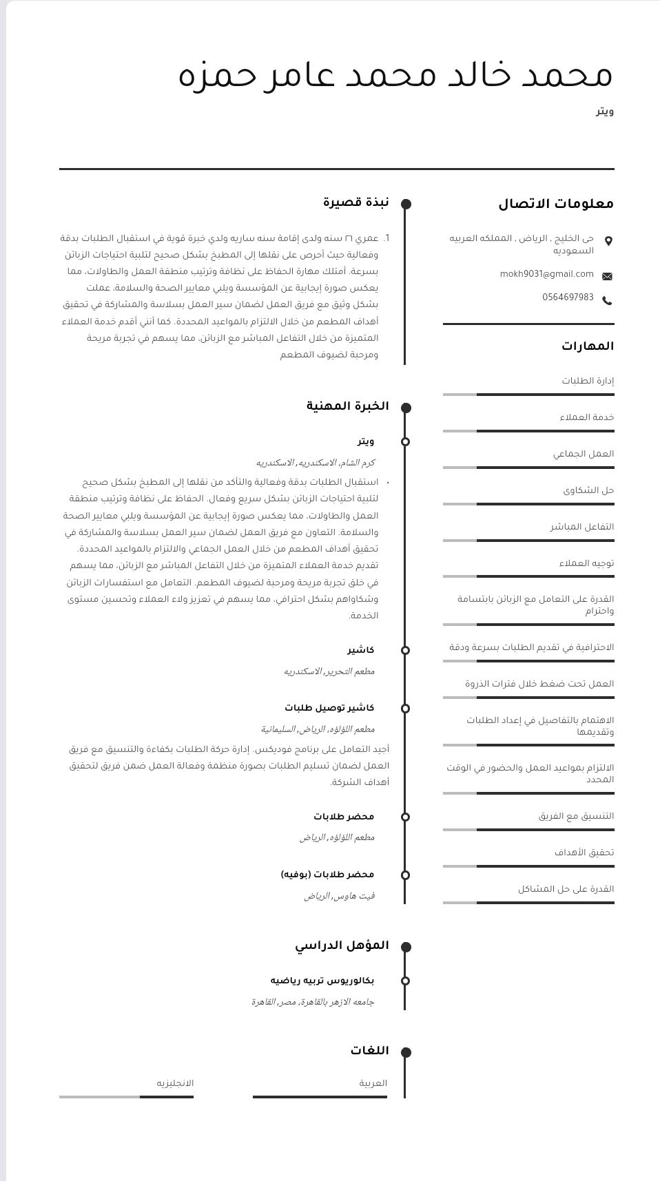 معي خبرة كبيرة في مجال المطاعم ومعي إقامة سنة سارية اشتغلت وايتر بكرم الشام في الاسكندرية واشتغلت كاشير بكشري التحرير في الاسكندرية واشتغلت وايتر بفندق الفور سيزن في الاسكندرية واشتغلت كاشير توصيل طلبات ومحضر طلابات بمطعم اللؤلؤة في السليمانية في الرياض واشتعلت عامل بوفيه بمطعم فيت هاوس في الرياض