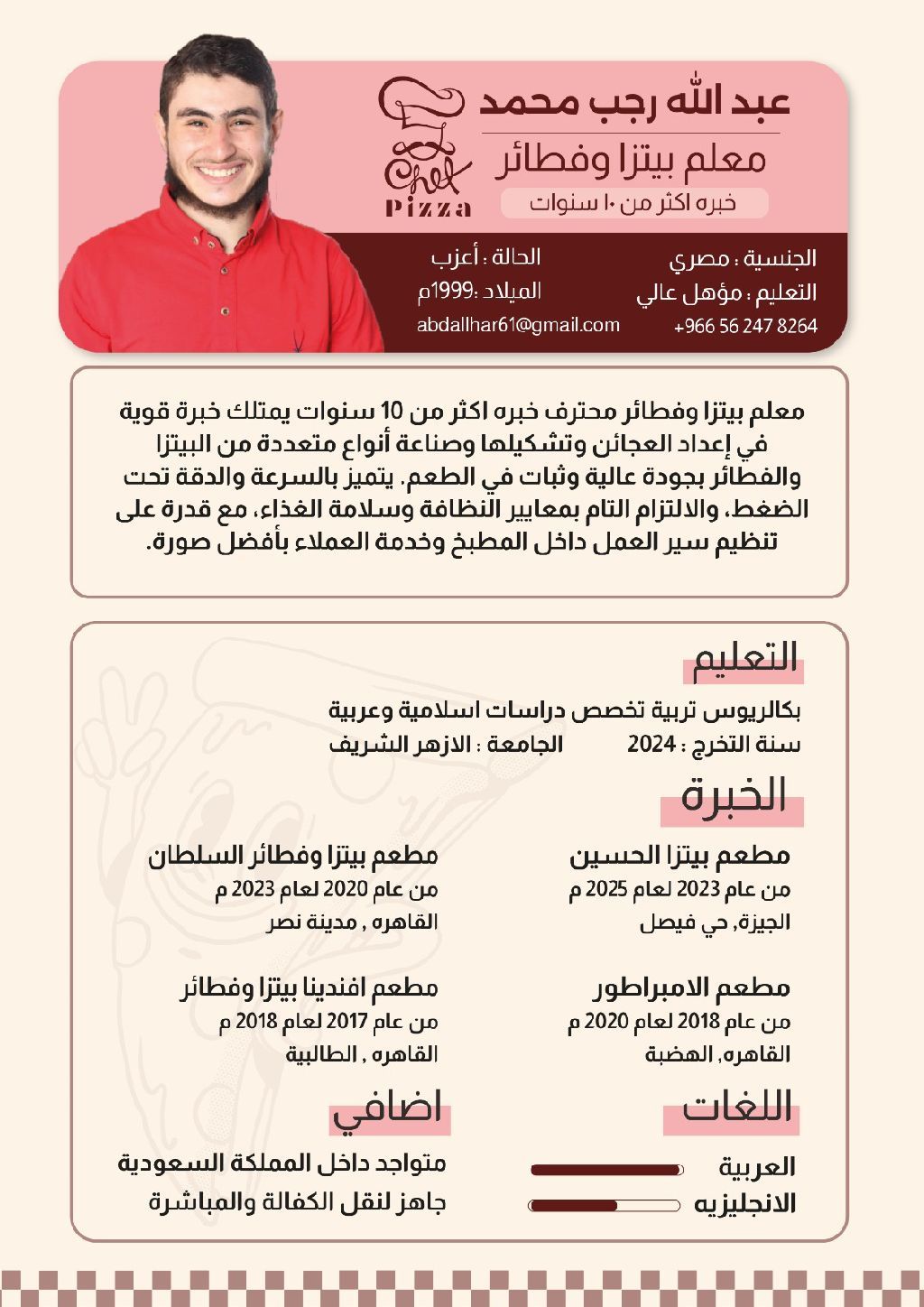 شيف بيتزا وفطائر ومعجنات اعمل في هذا المجال منذ أكثر من 10 سنوات