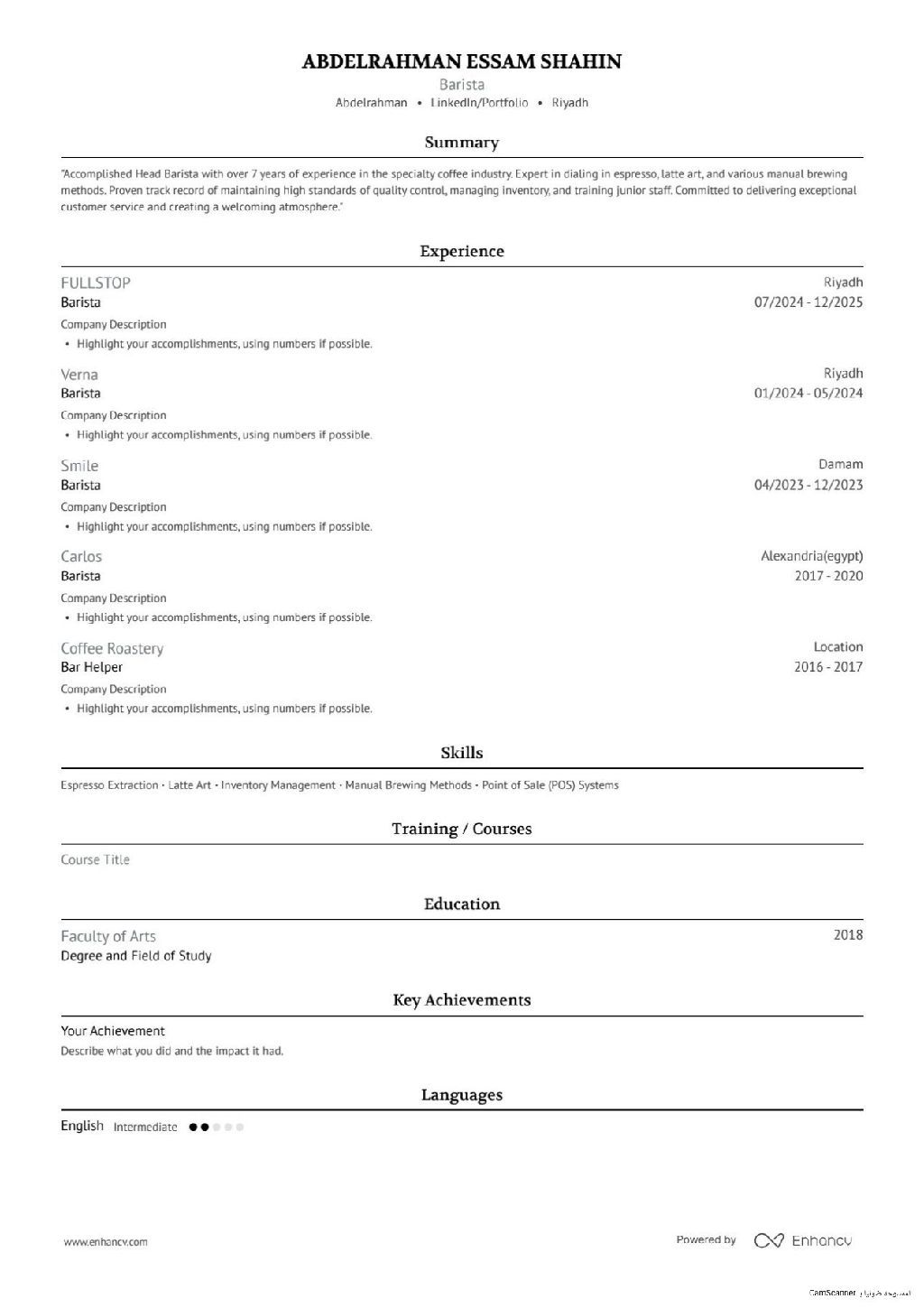 باريستا خبرة 7 سنوات ملم بجميع المشروبات الباردة والحارة والبان كيك والوافل والكريب