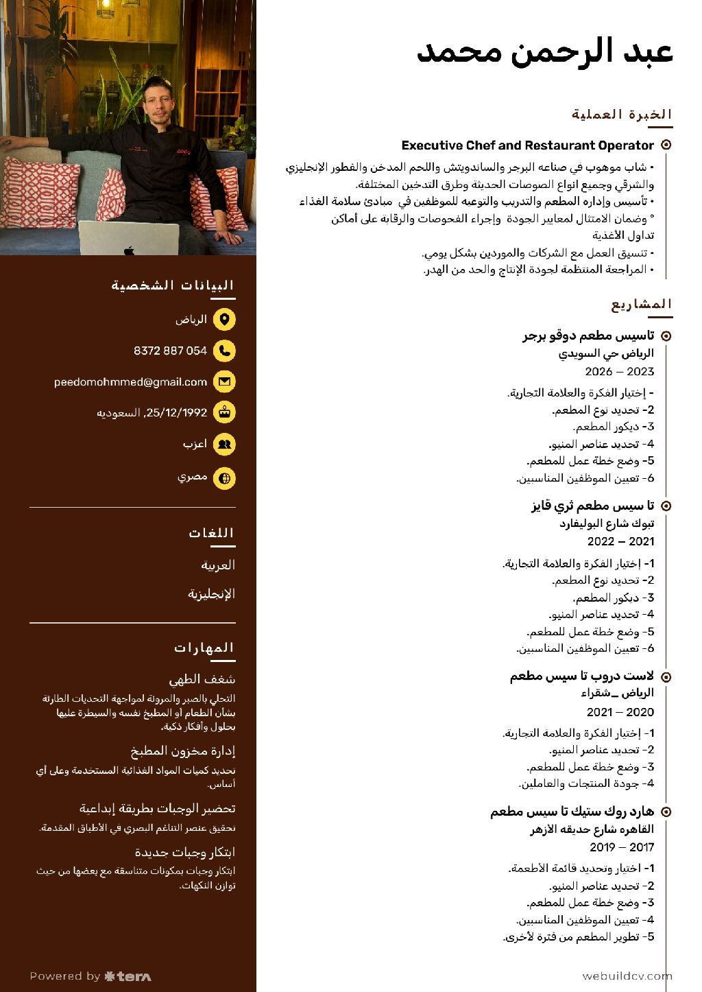 شاب موهوب في صناعة البرجر والساندويتش واللحم المدخن والفطور الانجليزي والشرقي وجميع أنواع الصوصات الحديثة وطرق التدخين المختلفة شيف تنفيذي واداري لثلاثه مطاعم مختلفه بالمملكة سابقا خبرة أكثر من 15 سنة - تأسيس وإدارة المطعم والتدريب للموظفين في مبادئ سلامة الغذاء وضمان الامتثال لمعايير الجودة تطوير قوائم طعام مبتكرة (Menu R D ضبط جودة الأطباق وتكلفة الطعام وتطبيق معايير HACCP وهيئة الغذاء